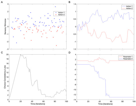 The results of the computer simulations help us to understand how choice consistency develops over time. In the beginning, if choices are hard, they stay statistically split between the possible actions (Figure 2A). However, because the choices are initially random, a small statistical imbalance appears as a function of the stimuli. The proposed minimization of total surprisals then takes over, slowly expanding this imbalance and breaking the symmetry. In Figure 2A,B, this expansion causes Action 1 to occur mostly for positive stimuli and Action 2 for negative ones. This separation between the choices is initially slow but then reveals the characteristics of phase transition. A way to understand this phase transition is by seeing the total consistency loss (Figure 2C—Equation (3)). After a first climb resulting from the addition of stimuli and actions, the loss collapses, reaching a low plateau at around . This collapse is accompanied by a sudden change in the second model parameter (Figure 2D). Other simulations yield comparable results, although the time of the phase transition and what parameters change can vary.