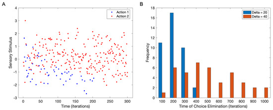 Figure 3A shows that with enough time, one choice may swamp the others. In this simulation, the equilibrium between the choices of Actions 1 and 2 persists until about . After that time, choices of Action 2 for positive stimuli start breaking the symmetry. By , most choices now go to Action 2, even in situations of slightly negative stimuli. Finally, after , the choice of Action 1 is eliminated, with the individual always picking Action 2. With forty simulations as in Figure 3, Action 1 or Action 2 always wins out, and the mean time at which one of the actions disappears as a choice is (standard deviation). Hence, the division of choices is not stable, and even with consistency, the brain may choose to drop some of them. The broad range of choice-disappearance times (Figure 3; blue bins) also implies individuality in the stability of decision-making based on the history of selections.