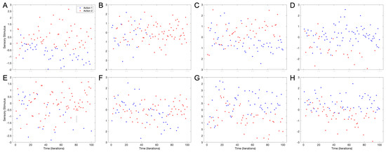 Eight consecutive simulations of actions in response to sensory stimuli with the standard set of parameters, using the conventions of Figure 2A. Each simulation yielded a unique pattern of behavior. After a first random phase, the most common behaviors were such that positive sensory stimuli tended to yield Action 1 (Panels D,G,H) or Action 2 (Panels A,C,E). In these behaviors, negative sensory stimuli tended to yield the opposite actions. Occasionally, we also saw a behavior that was more mixed (Panel B). More rarely, we saw a behavior in which an action happened for positive stimuli earlier and negative ones later (F).