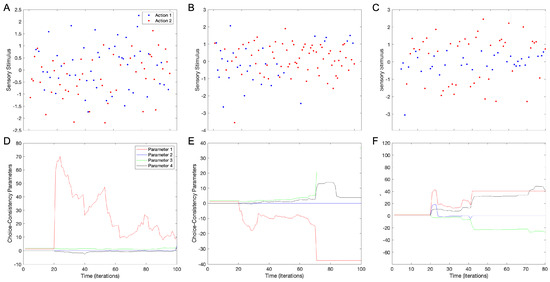 Increasing the number of choice parameters boosts the individuality arising from the model. In these simulations, we substituted for the standard value in Table 1 and thus, we had four choice parameters instead of two. (A–C) Examples of choices (with conventions as in Figure 2A). (D–F) Temporal evolution of parameters in the simulations of (A, B, and C) respectively. Most simulations with 4 choice parameters yielded behaviors like those in Figure 4. However, some simulations yielded different behaviors, as illustrated in this figure. (A,D) Examples of not discriminating actions by stimuli. (B,E) Examples of switching stimulus dependence of choices. (C,F) Examples of Action 1 sandwiched between two stimulus locations of Action 2.