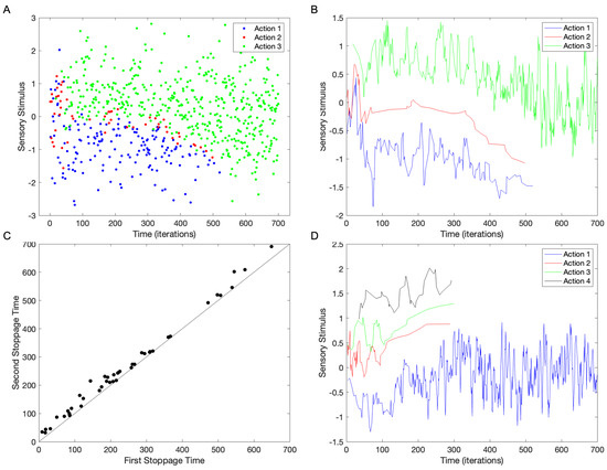 The increase in the number of choice parameters from two to four boosts individuation by adding new choice behaviors. Most simulations (out of forty) still give behaviors as in Figure 2, Figure 3 and Figure 4 (). However, three new behaviors appear with more parameters. The first, and the rarest, is the continued intermingling of Actions 1 and 2 regardless of the stimuli ( of the simulations—Figure 5A). The second is cases in which one choice shifts to different stimuli during the simulation ( of the simulations). Thus, in Figure 5B, Action 2 tends to occur with negative stimuli until about , but then shifts to positive ones after that. Finally, the third is a behavior in which a choice at intermediate stimuli ( in Figure 5C) has the other choice for higher and lower stimuli (−1 and 1 in Figure 5C). We have even seen such a sandwich behavior with four bands, for example, Action 1, Action 2, Action 1, and Action 2, as the stimulus increases. This sandwich behavior happens in of the simulations.