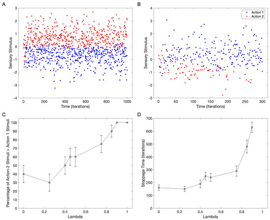 The interaction between rewards and choice consistency with standard parameters, except for variations of . (A) Simulation with only rewards (). As expected from the choice of the standard parameters, Action 2 is chosen for positive stimuli and vice versa for Action 1. (B) Example of simulation with in which positive stimuli elicit Action 1 despite the rewards favoring the opposite. (C) Percentage of simulations for which Action 2 stimuli converge to values larger than those for Action 1 as a function of . (D) Mean stoppage time of the losing actions as a function of . Error bars in (C,D) are standard errors. As increases, we obtain more Action 2 because of the rewards, and the stoppage time rises because the influence of choice consistency diminishes.