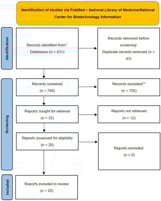 Flow diagram according to PRISMA-ScR guidelines, (https://www.prisma-statement.org/scoping/, accessed on 23 June 2024); * indicates that database used for the search (https://pubmed.ncbi.nlm.nih.gov/, accessed between 23 June 2024 and 31 October 2024); ** indicates all articles excluded at the time of abstract review due to either their focus (e.g., articles on the management of brain tumours not dealing with the use of nanoconjugates or articles on nanomedicine not focused or not fully dedicated to neuro-oncology) or design (non-original investigations such as case reports, editorials, and letters to editors).