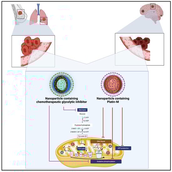 Dual targeting of primary malignancy and brain metastases. This image shows how polymeric nanoparticles loaded with Platin-M and chemotherapeutic glycolytic inhibitors are able to enter the mitochondria of primary malignancy in breast or lung cancers, as well as their secondary brain lesions. This approach has been proposed in breast-induced brain metastases by Ashokan et al. [70]. Created in BioRender. Khilar, S., 2025 (https://BioRender.com/d46l747/, last modified on 21 January 2025).