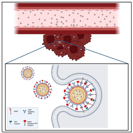 As seen in previous paragraphs, NPs have been used to bypass BBB, and with regard to metastatic lesions, one of the proposed strategies revolved around ferritin NPs (HFn) binding to the transferrin receptor 1 (TfR1) [104,105,106]. Sevieri et al. [107] conjugated TZ and HFn to compose an NP, termed H-TZ, which could specifically target HER2, as well as the TfR1 (see Figure 4).