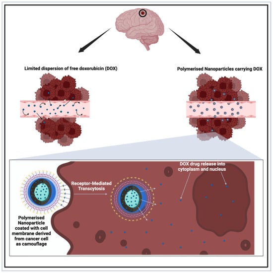 Receptor-mediated trancytosis can also be used to increase cancer cells’ toxicity. Such a Trojan-horse strategy can be used to facilitate the release of Doxorubicin (DOX) into the cytoplasm and nucleus by nanoparticles exploiting a mimicry coating based on cancer-cell-derived membranes. This strategy has been nicely described in breast-induced brain metastases by Liu et al. [111]. Created in BioRender. Khilar, S., 2025 (https://BioRender.com/m06x929/, last modified on 21 January 2025).