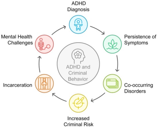 Attention deficit hyperactivity disorder has been studied for its impact on various aspects of individual behavior, particularly in the context of criminal behavior. Numerous studies have indicated a significant correlation between ADHD symptoms and an increased risk of engaging in criminal activities [32,33,34,35,36,37]. It was suggested that individuals with ADHD, particularly those who were not diagnosed early or who did not receive appropriate interventions, were more likely to exhibit impulsive behaviors that can lead to criminal actions, especially during adolescence [32,33,34].