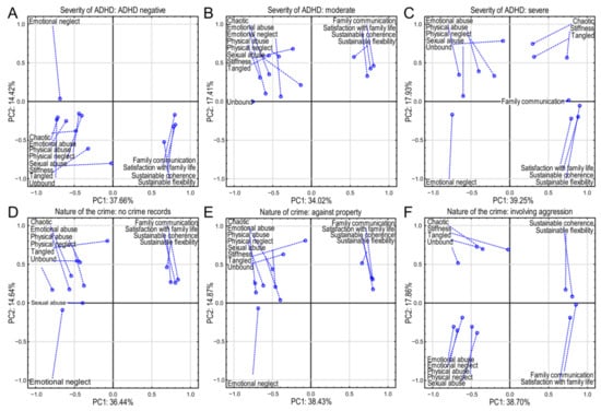 Principal component analysis (PCA) of family environment factors and their relationship to ADHD severity and criminal behavior. Six biplots display the relationships between family environment variables and principal components (PC1 and PC2) for six groups: three levels of ADHD severity (negative, moderate, severe; panels (A–C)) and three types of criminal behavior (no crime, crime against property, crime involving aggression; panels (D–F)). Each point represents a variable. The closer a point is to an axis, the higher the correlation (positive or negative) with that PC. The percentage of variance explained by each PC is shown. The dashed lines connect the variables to their coordinates.