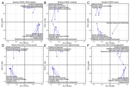 Principal component analysis (PCA) biplots illustrating the relationships among psychological and behavioral characteristics and ADHD severity and criminal behavior. Each panel displays the loading of variables on the first two principal components (PC1 and PC2). The percentage of variance explained by each PC is indicated. Points closer to the axes indicate stronger positive (positive side of the axis) or negative (negative side of the axis) correlations. Dashed lines connect each variable to its coordinate. (A–C) Associations of psychological and behavioral characteristics with different levels of ADHD severity. (D–F) Associations of psychological and behavioral characteristics with different types of criminal behavior.