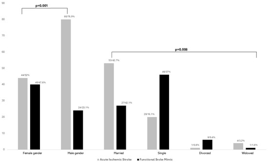 Comparison of gender and marital status distribution between patients with acute ischemic stroke and functional stroke mimics.