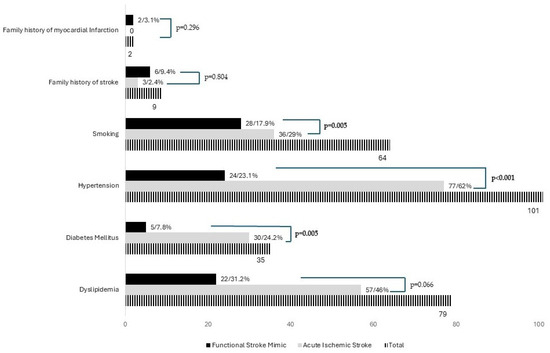 The prevalence of cerebrovascular risk factors differed between FSM and AIS (Figure 2), with a higher proportion of smoking (29% vs. 17.9%, p = 0.005), hypertension (62% vs. 23.1%, p = 0.001), and diabetes mellitus (24.2% vs. 7.8%, p = 0.005) observed in the AIS group.