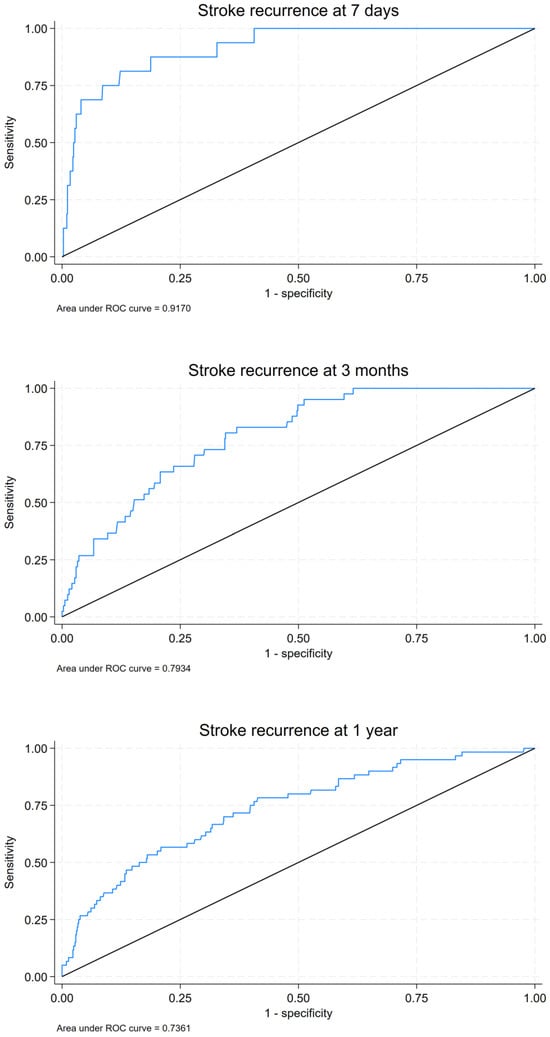 Receiver operating characteristic (ROC) curve for stroke recurrence at 7 days, 3 months, and 1 year. The blue line represents stroke recurrence, and the black line indicates the reference (AUC = 0.5).