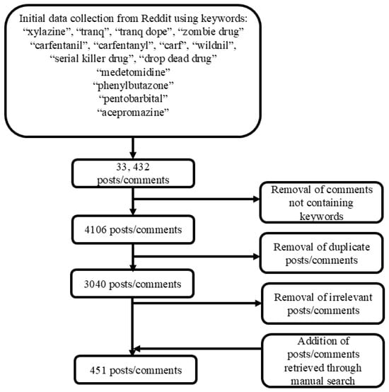 Initial research was conducted to identify the main slang words for the drugs of interest (e.g., “tranq dope”), given the use of social media as a source of data collection. No street names for medetomidine, phenylbutazone, pentobarbital, and acepromazine were identified. Reddit posts and comments were collected and screened using the web-scraping software Apify [23] between June and July 2024 (Figure 1). Data collection steps included the following: