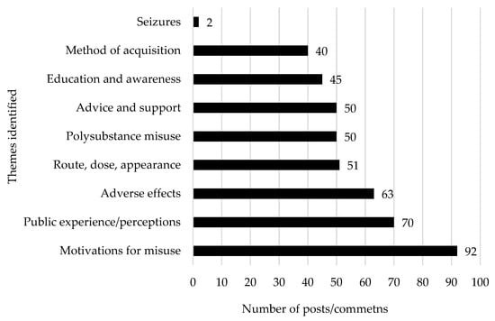 After the collected data were screened, 451 posts/comments were deemed relevant for this study. Figure 2 illustrates the number of relevant posts and comments retrieved for each specific substance, with xylazine generating the highest number of entries, followed by carfentanil, pentobarbital, medetomidine, phenylbutazone, and acepromazine. Figure 3 presents the most prevalent themes encountered within the manual thematic analysis. The theme “motivations for misuse” was most frequently discussed, followed by “public experience/perceptions” and “adverse effects”. Other prominent themes included “route, dose, and appearance”, “polysubstance misuse”, and “advice and support”.
