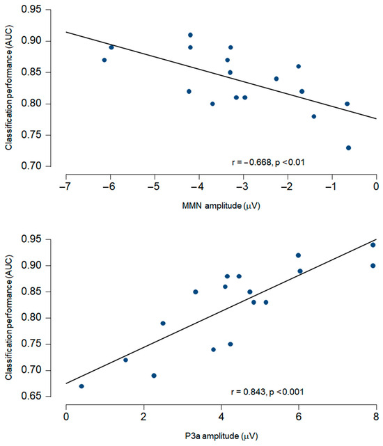 Using a Pearson correlation test, the classification performance was found to be strongly correlated with the amplitudes of both MMN (r(15) = −0.668, p < 0.01) and P3a components (r(15) = 0.843, p < 0.01) (see Figure 2).