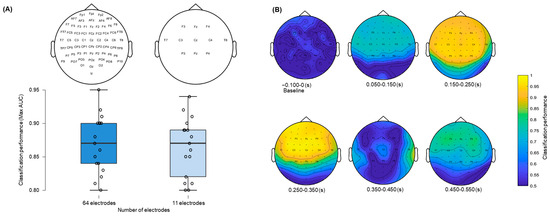 Effect of a reduced number of electrodes on classification performance and searchlight analysis across control subjects. (A) The paired-sample t-test revealed no significant differences in classification performance using 64 electrodes in comparison to 11 electrodes. (B) The searchlight MVPA computed over the baseline and 50 ms time intervals after stimulus onset showed the electrodes that better discriminated between conditions.