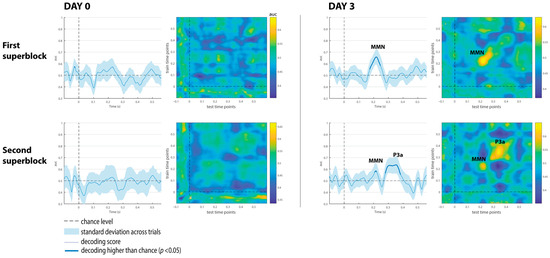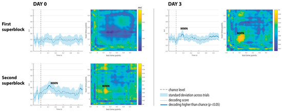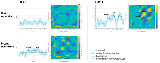 Patient 3 displayed a maximum AUC of 63% around 120 ms at the second superblock on day 0, and an AUC of 60% at an early time interval, close to 100 ms on day 3 (see Figure 6). The time generalization decoding matrices revealed early decoding, limited to the diagonal associated with either the latency of the MMN or the DRN component (i.e., a deviant-related negativity, which represents a spatial–temporal summation of both N1 and MMN components), as described in [23].
