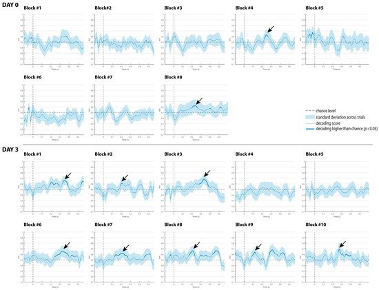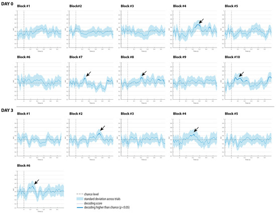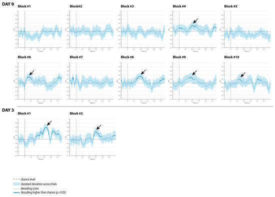 Classification performance of Patient 1 at each single block on day 0 and day 3. The shaded area is the standard deviation across trials. The thick line indicates the time points whereat decoding is significantly higher than chance level. Black arrows indicate the blocks with reliable classification performance.