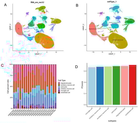 ECs are the most significant contributors to AD among all cell subpopulations in the brain. (A) UMAP plot of all cells in the GSE157827 dataset, highlighting clustering into 16 subtypes based on transcriptomic profiles, with numeric labels in various colors representing individual clusters. (B) UMAP plot annotated with six major cell types: oligodendrocytes, excitatory neurons, astrocytes, inhibitory neurons, microglia, and ECs. The spatial distribution highlights the clustering of distinct cell populations, reflecting their transcriptional heterogeneity. (C) Stacked bar plot displaying the percentage composition of each cell type across samples, revealing variability in cell type proportions among individuals. (D) Bar plot of fold change scores (FCscore), quantifying the contribution of each major cell type to AD.