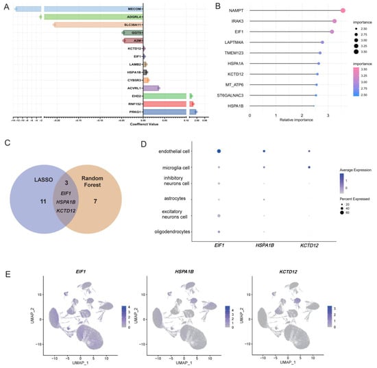Identification of EC−related key genes for AD through machine learning. (A) Coefficient values of the 14 characteristic genes of AD identified by LASSO regression. (B) Relative importance of top 10-ranking genes identified by the random forest algorithm. (C) Venn diagram displaying the overlap of three key genes (EIF1, HSPA1B, and KCTD12) identified by LASSO regression and random forest analysis. (D) Dot plot showing the expression levels of EIF1, HSPA1B, and KCTD12 across six major cell types. (E) UMAP plots illustrating the percentage of cells expressing the genes EIF1, HSPA1B, and KCTD12 within different cell types, respectively. It should be noted that KCTD12 exhibited its highest expression in microglial cells rather than ECs. Consequently, EIF1 and HSPA1B were selected for further investigation in the present study as pivotal genes associated with AD.