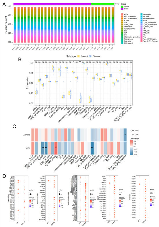 Increasing evidence indicates that peripheral immunoinflammatory processes play a crucial role in the progression of AD. To validate this notion, our own dataset was utilized. The distribution of peripheral immune cells in each patient is depicted in Figure 4A, and notable differences in the abundance of inflammation-promoting cells and mast cells were observed between AD clinical continuum patients and NC subjects (Figure 4B). Further investigation demonstrated that EIF1 displayed a significant positive correlation with cytolytic activity and a significant negative correlation with B cells, CCR, pDCs, and other immune cells. HSPA1B was inversely correlated with the Type II IFN response (Figure 4C). Moreover, by utilizing the TISIDB database (http://cis.hku.hk/TISIDB/, accessed on 22 October 2024) [19], multiple significant correlations were observed between EIF1 and HSPA1B with various immune factors, including chemokines, immunosuppressive factors, immunostimulatory factors, MHCs, and receptors (Figure 4D).