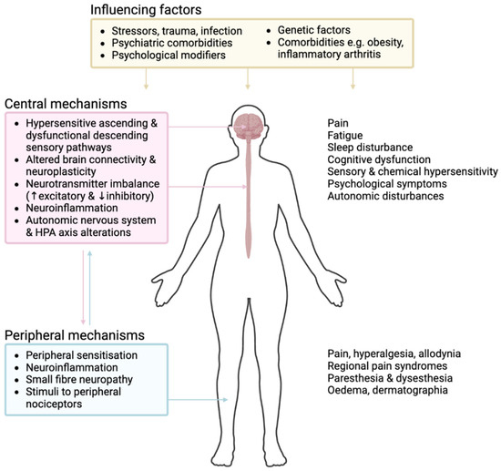 Overview of pathogenic mechanisms in fibromyalgia. Our understanding of the pathogenesis of fibromyalgia is evolving. Various predisposing factors may contribute to the development of fibromyalgia, where a complex interplay of multiple mechanisms occurs at both central and peripheral aspects of pain- and sensory-processing pathways, resulting in the sensitisation of ascending excitatory pathways and dysfunctional inhibitory pathways. Involved mechanisms include central neuroplasticity, neurotransmitter and neuropeptide imbalance, and modification and influence of the autonomic nervous system and HPA axis. Additional peripheral factors, such as ongoing nociceptive input and small fibre neuropathy, may also affect pathogenesis. Interaction between the nervous and immune systems, with resultant neurogenic neuroinflammation, contributes to many of these mechanisms. HPA, hypothalamic–pituitary–adrenal. Figure created with biorender.com.
