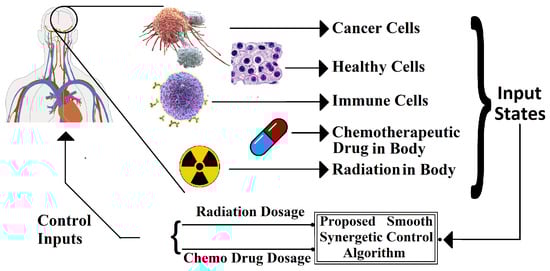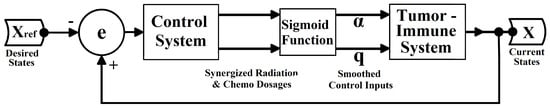 An updated mathematical model describing brain tumor dynamics and the simultaneous impact of radiotherapy and chemotherapy on them has been utilized to formulate a smooth synergetic controller for tumor mitigation and control. The study proposes a closed loop feedback process, depicted in Figure 2, to hamper brain tumor advancements by automatically adjusting the control inputs (i.e., chemo and radiation dosages). The mathematical model that describes the brain tumor dynamics as well as their interaction with different state variables is highly complex and nonlinear. Thus, it is natural to consider nonlinear control algorithms for the containment of tumor spread. However, the nonlinear controllers are generally very robust and they tend to converge the error function to zero as fast as possible []. For the application of tumor mitigation using nonlinear control, this extra fast convergence rate implies that these algorithms tend to compute very high control inputs or drug dosages to decimate the tumor population swiftly [,]. These extra high dosages of anti-tumor therapies, however, become very problematic for the patient under consideration, as these therapies either utilize toxic drugs or harmful radiations for tumor reduction, which are very injurious to the human body [].