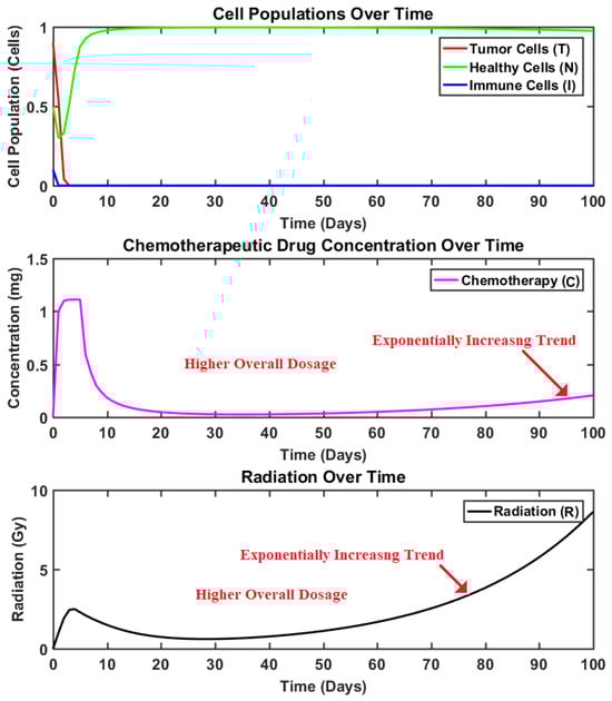 Similarly, the mathematical system model presented in Equation (1) considers separate mathematical terms to represent the impact of radiotherapy and chemotherapy on system states. Thus, to design the control law to regulate radiation dosage, the state variable “C” is considered to be zero. This will remove the impact of chemotherapy from the system so that the control law related to the radiation control input may be designed separately. This process is then repeated again by considering the state variable “R” to be zero, thus removing the terms that represent the impact of radiation from the system dynamics. Hence, the control law to govern chemotherapeutic drug input is then derived independently. Hence, by considering both the control laws simultaneously, a multi-control input algorithm is designed to compute both chemo and radiation dosages simultaneously. Thus, a more efficient and effective control strategy is devised, that not only reduces the administered chemotherapeutic drug dosages by relying on radiotherapy, but also lessens the harmful impacts of chemotherapy on patients’ health and well-being.