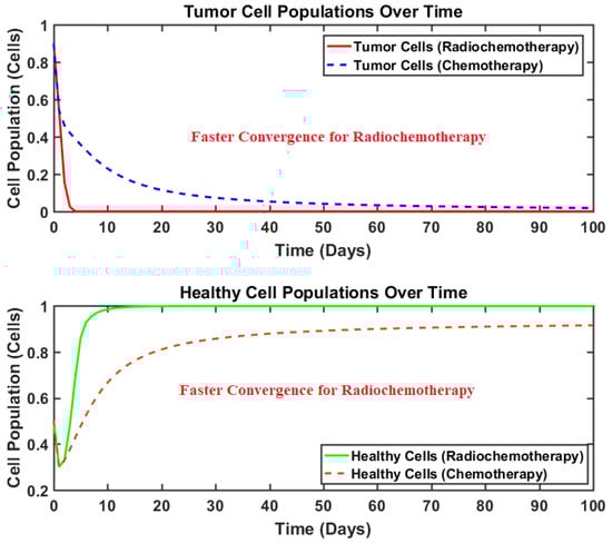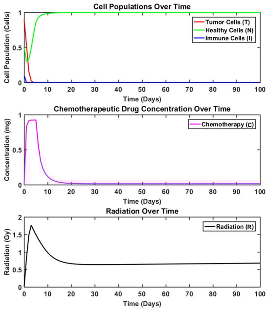 The ordinary differential equations (ODEs)-based tumor-mathematical model utilized by this study encapsulates the intricate interactions among different cell populations and the applied treatment procedures. This model extends prior ODE-based tumor dynamics by incorporating the simultaneous impact of radiotherapy and chemotherapy [,]. The following state variables are considered in this model: