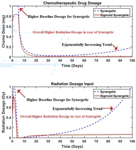 The algorithms proposed in the recent literature have been designed according to the requirements of numerous tumor therapies that utilize different tumor dynamics. Thus, a quantitative comparison has been presented in Table 5 so that the performance of the proposed sigmoid-based synergetic controller may be compared to other similar studies that utilize the same type of anti-tumor therapies and initial conditions. The comparison given in Table 5 considers three parameters on the basis of which the performance of the considered algorithms is evaluated. The first criterion of comparison is the initial or baseline drug or radiation dosage administered by the mentioned algorithm. This reduction in the baseline dosage is calculated in percentage by comparing it to the baseline dosages of the proposed sigmoid-based synergetic controller as depicted in Figure 6. Similarly, the second criteria for comparison is based on the time (in days) taken by the specific algorithms in comparison to that taken by the proposed sigmoid-based synergetic controller to bring the tumor cell population to zero. Lastly, the third parameter in Table 5 depicts how much reduction in treatment intensity (i.e., the total radiation and chemo drug dosage administered by the algorithm) has occurred in comparison to the other recently proposed techniques over the span of the whole treatment therapy.