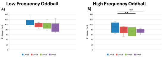 Boxplot representing the P1 latency in the two oddball paradigms: low frequency (A) and high frequency (B), in response to the different stimulus intensities employed in the study (20, 30, 40, 50 dB). In each box, “x” stands for the mean value and the line stands for the median value. ** stands for p ≤ 0.01.