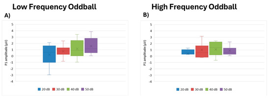 Boxplot representing the P1 amplitude in the two oddball paradigms: low frequency (A) and high frequency (B), in response to the different stimulus intensities employed in the study (20, 30, 40, 50 dB). In each box, “x” stands for mean value and the line stands for the median value.