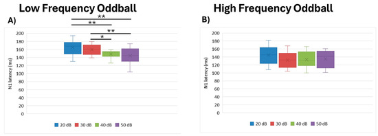Boxplot representing the N1 latency in the two oddball paradigms: low frequency (A) and high frequency (B), in response to the different stimulus intensities employed in the study (20, 30, 40, 50 dB). In each box, “x” stands for the mean value and the line stands for the median value. ** stand for p ≤ 0.01; * stand for p ≤ 0.05.