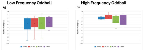 Boxplot representing the N1 amplitude in the two oddball paradigms: low frequency (A) and high frequency (B), in response to the different stimulus intensities employed in the study (20, 30, 40, 50 dB). In each box, “x” stands for the mean value and the line stands for the median value.