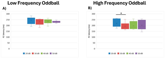 Boxplot representing the P2 latency in the two oddball paradigms: low frequency (A) and high frequency (B), in response to the different stimulus intensities employed in the study (20, 30, 40, 50 dB). In each box, “x” stands for the mean value and the line stands for the median value. * stands for p ≤ 0.05.