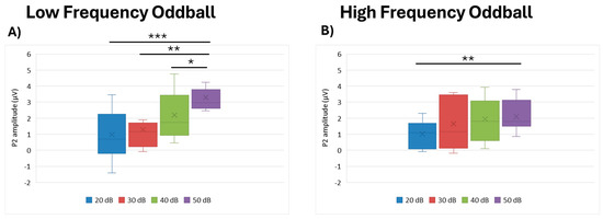 Boxplot representing the P2 amplitude in the two oddball paradigms: low frequency (A) and high frequency (B), in response to the different stimulus intensities employed in the study (20, 30, 40, and 50 dB). In each box, “x” stands for the mean value and line stands for the median value. *** stands for p ≤ 0.001; ** stands for p ≤ 0.01; * stands for p ≤ 0.05.