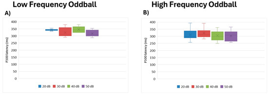 Boxplot representing the P300 latency in the two oddball paradigms: low frequency (A) and high frequency (B), in response to the different stimulus intensities employed in the study (20, 30, 40, and 50 dB). In each box, “x” stands for the mean value and the line stands for the median value.