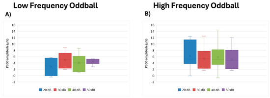 Boxplot representing the P300 amplitude in the two oddball paradigms: low frequency (A) and high frequency (B), in response to the different stimulus intensities employed in the study (20, 30, 40, and 50 dB). In each box, “x” stands for the mean value and the line stands for the median value.