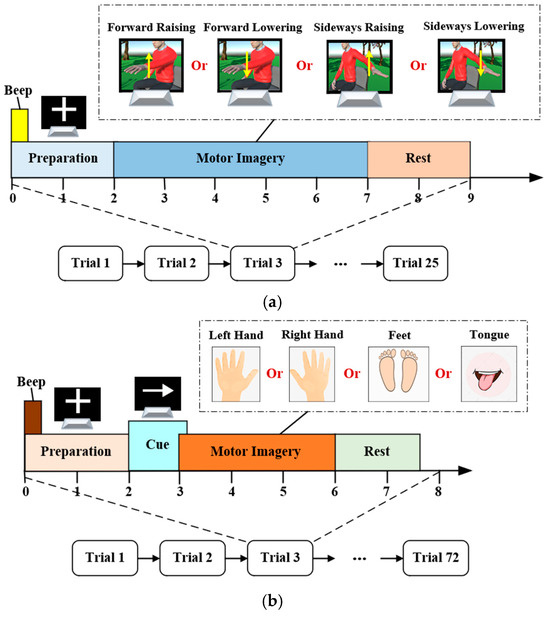 The timing scheme for the EEG acquisition process within a session. In the ADL-MI dataset, 25 sampled trials were recorded per session, with each MI task execution lasting 5 s. In the IV-2a dataset, each MI task recorded 72 sampled trials per session, with MI performed for 3 s in each trial. (a) ADL-MI dataset, (b) IV-2a dataset.