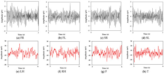 Original EEG segments. (a–d) show a trial for subject A1 from the ADL-MI dataset. (e–h) show a trial for subject B1 from the IV-2a dataset, where the amplitude is the mean value of all EEG channels. ADL-MI contains 64 channels and IV-2a contains 22 channels.