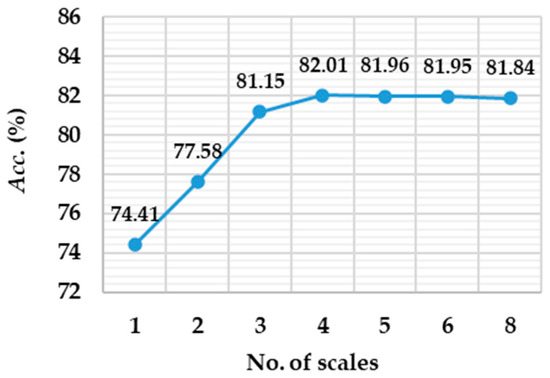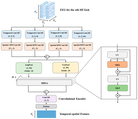 To capture the TSFs of high-dimensional and time-varying MI-EEG, based on convolutional operations and the multi-head self-attention mechanism (MHSA), a multi-scale temporal-spatial feature extractor (MTSFE), noted as , is developed to extract the TSFs of , , … in sequence. The MTSFE architecture is shown in Figure 4.
