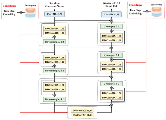 Architecture of LU-Net. Time step embedding with prototypes is employed as a diffusion condition of LU-Net to constrain the generation of old MI task TSF, “↑” represents the upsampling operation, “↓” represents the downsampling operation.