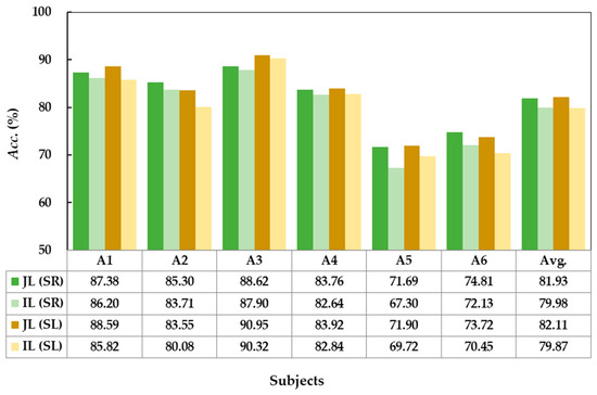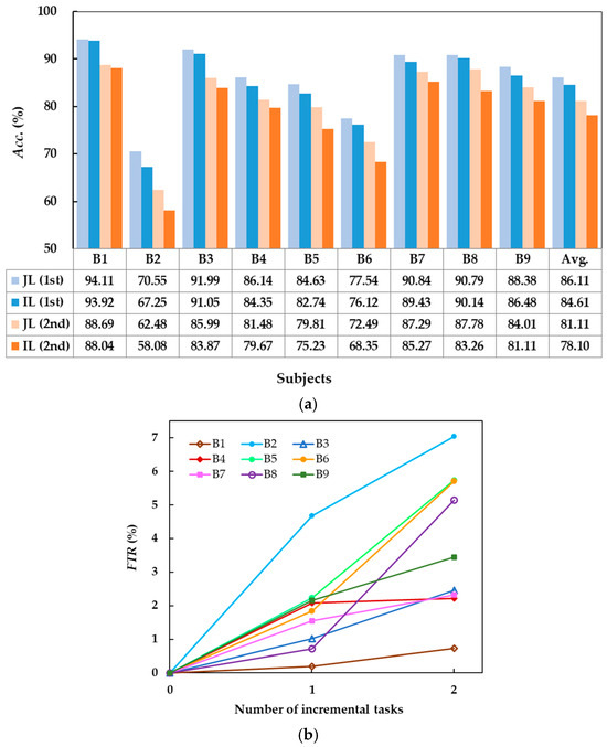 To evaluate the learning ability of GD-TIL for unknown tasks, on the ADL-MI dataset with an incremental MI pair, the Acc. of incremental learning (IL) for the added MI pair, including arm sideways raising (SR) and lowering (SL), is compared with its Acc. in joint learning (JL) in Figure 6. The average Acc. of the SR task is 82.79% in IL, which is only 1.12% lower than the 83.91% in JL, and the average Acc. of the SL task is 79.87% in IL, which is 2.24% lower than the 82.11% in JL. Across subjects, IL achieves accuracies comparable to JL for both SR and SL. Comparative results show that GD-TIL can effectively adapt to new tasks and maintain a high level of performance consistency when learning new tasks incrementally.