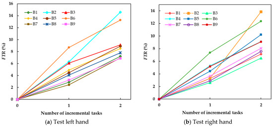 The forward transfer rate (FTR) [41,42] is introduced to evaluate the plasticity of an IL model, in other words, the model’s ability to learn unseen tasks continuously. FTR defines the change rate in the decoding accuracies of the model for a given task when it is learned jointly and as the nth incremental task. FTR can be calculated as follows: