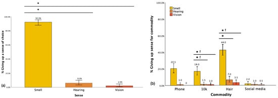 Giving up each sense for all respondents by (a) required choice, (b) commodities. Note: * indicates statistical significance, ‘f’ indicates use of Fisher’s exact test, error bars show confidence interval of 95%.