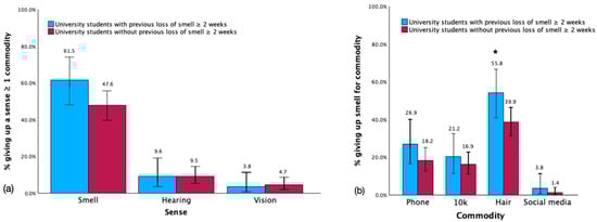 Giving up (a) each sense for ≥ one commodity between the university students with and without previous loss of smell for ≥ two weeks, (b) smell for each commodity. Note: * indicates statistical significance, error bars show confidence interval of 95%.