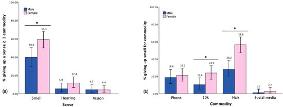 Giving up (a) each sense for ≥ one commodity between genders, (b) smell for each commodity. Note: * indicates statistical significance, error bars show confidence interval of 95%.