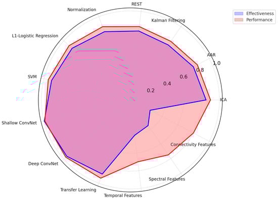 - Independent Component Analysis (ICA) and Normalization exhibit the highest effectiveness and performance, making them crucial for artifact removal and data standardization.