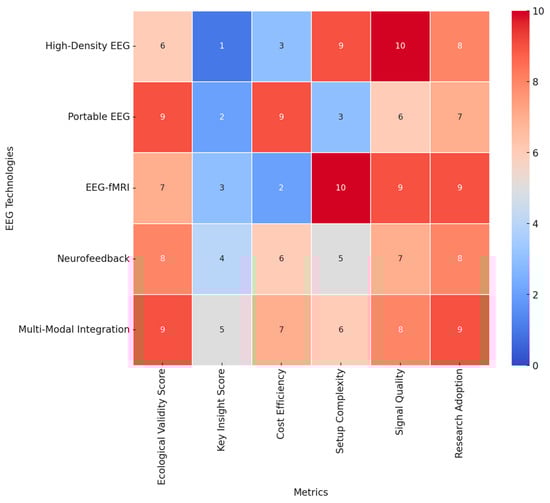 - Signal Quality: High-density EEG provides the highest signal quality (score: 10), offering superior temporal and spatial resolution. Portable EEG, while ecologically valid, has lower signal quality (score: 6).