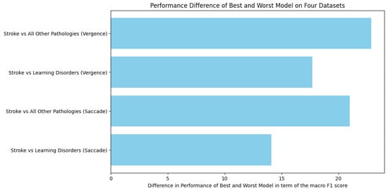 Relative to the previous analysis, when comparing the performance differences between the best and worst models across the different datasets, as shown in Figure 1, the order of the three models in terms of overall performance (F1 score) remains consistent across both eye movement tasks.